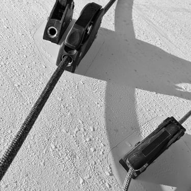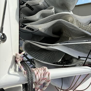 Les bosses de ris d'origine n'ont pas résisté aux efforts engendrés par notre grand-voile. On en met de meilleure qualité en dynema avec des sur-gainages aux endroits stratégiques.