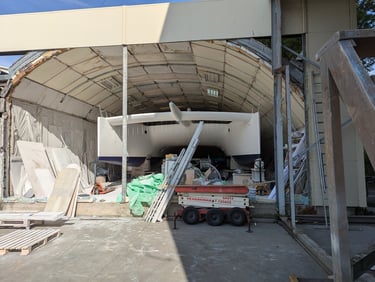 Dans le même temps, la façade du hangar est tout simplement démontée pour sortir le bateau.