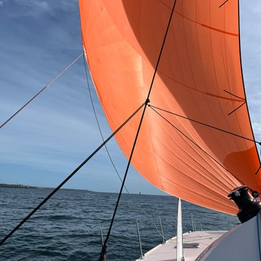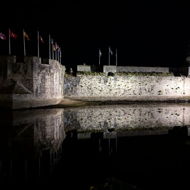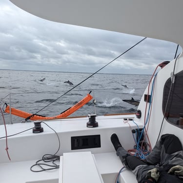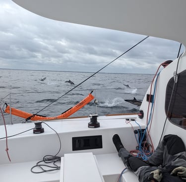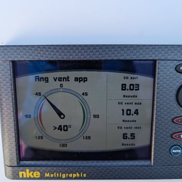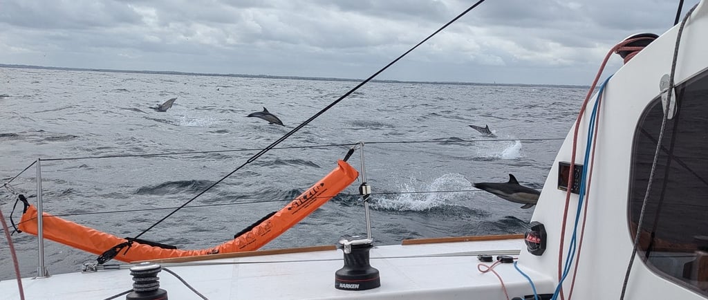 Nous reprenons la mer après le coup de vent et avec 2 batteries de secours ajoutées à notre installation. Après le contournement de l'île de Batz au près dans une bonne brise, un groupe de dauphins nous rend visite quelques instants. A l'entrée du chenal du four, alors que le vent à fortement molli, nous rejoignons la flotte de la course du figaro qui arrive d'Angleterre, en direction de Piriac-sur-Mer. Toute la "garde robe" des voiles d'avant est utilisée alors que nous contournons la côte du Finistère Nord et que le vent se renforce. Nous faisons finalement route sur Morgat avec le spi lourd et faisons quelques belles pointes à 15 nœuds en approche du Cap de la Chèvre. Nous profitons de la baie bien abritée de Morgat pour faire un contrôle de gréement. Bernard est hissé en haut du mât. Tout va bien, seulement quelques petits détails qui devront être traités à l'intersaison. Nous repartons au près en direction du Raz de Sein où nous hissons le spi léger pour traverser la baie d'Audierne et poursuivons notre route jusqu'à Concarneau. Belle visite de la ville totalement déserte à la nuit tombée. Nous repartons avec un vent de nord très léger et une mer parfaitement plate. C'est l'occasion d'apprécier les capacités sous voiles de Mélité dans ces conditions alors que les autres plaisanciers sont au moteur. Nous poursuivons notre route jusqu'à Quiberon pour retrouver Philippe qui nous a survolé dans l'après-midi. Le lendemain, le vent a tourné à l'est et nous tirons des bords pour notre ultime navigation vers Arzal. Nous franchissons l'écluse et Mélité rejoint sa bouée