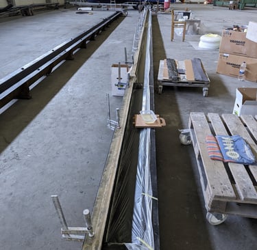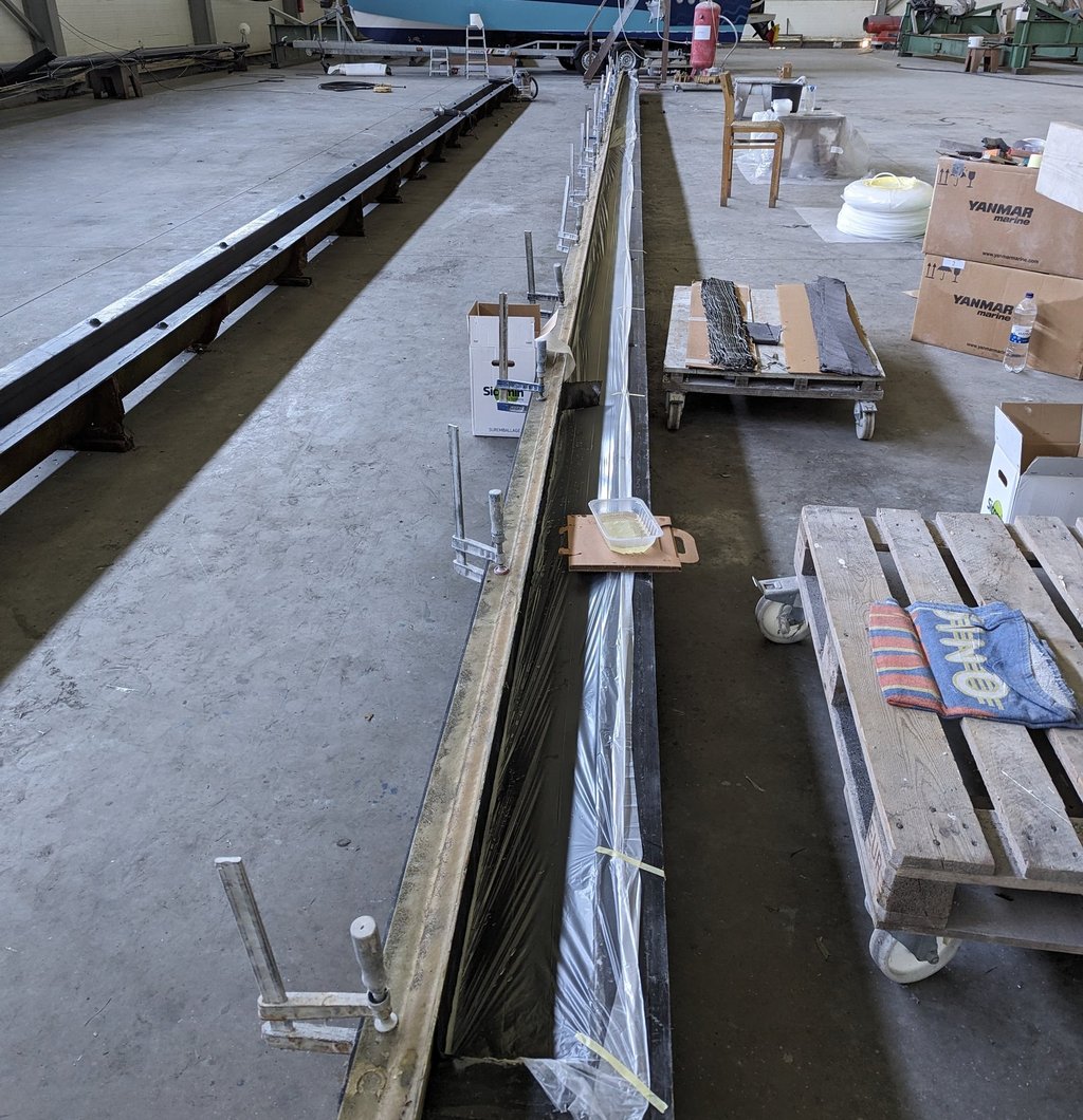 La fabrication du mat démarre avec les première "infusions" dans le moule de 19 mètres de long.