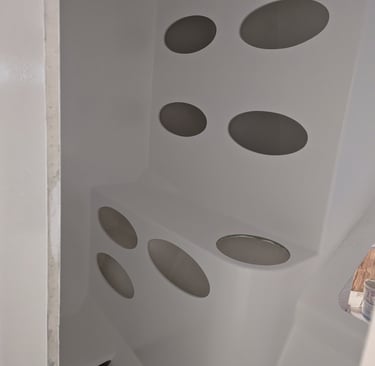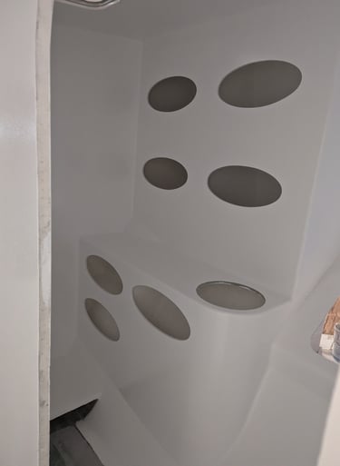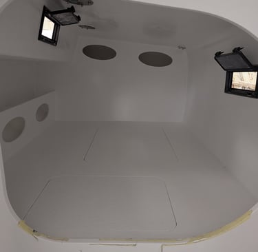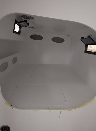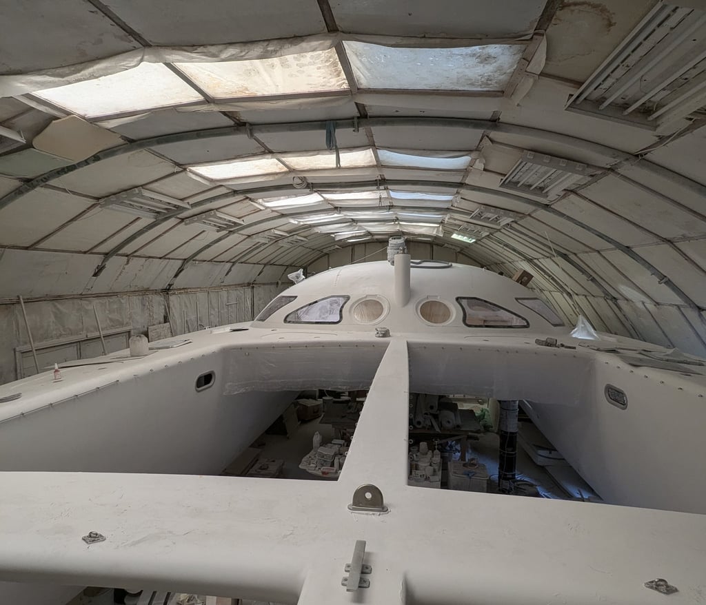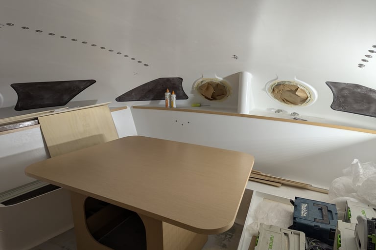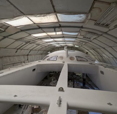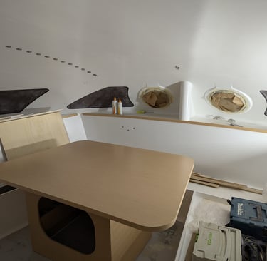 La peinture intérieure est terminée. l'installation des menuiseries intérieures et de l'accastillage de pont démarre. La peinture du mat est également réalisée. Le rail de guindant de grand voile est posé. On poursuit avec les réas et bloqueurs de drisse, le losange et le passage des drisses